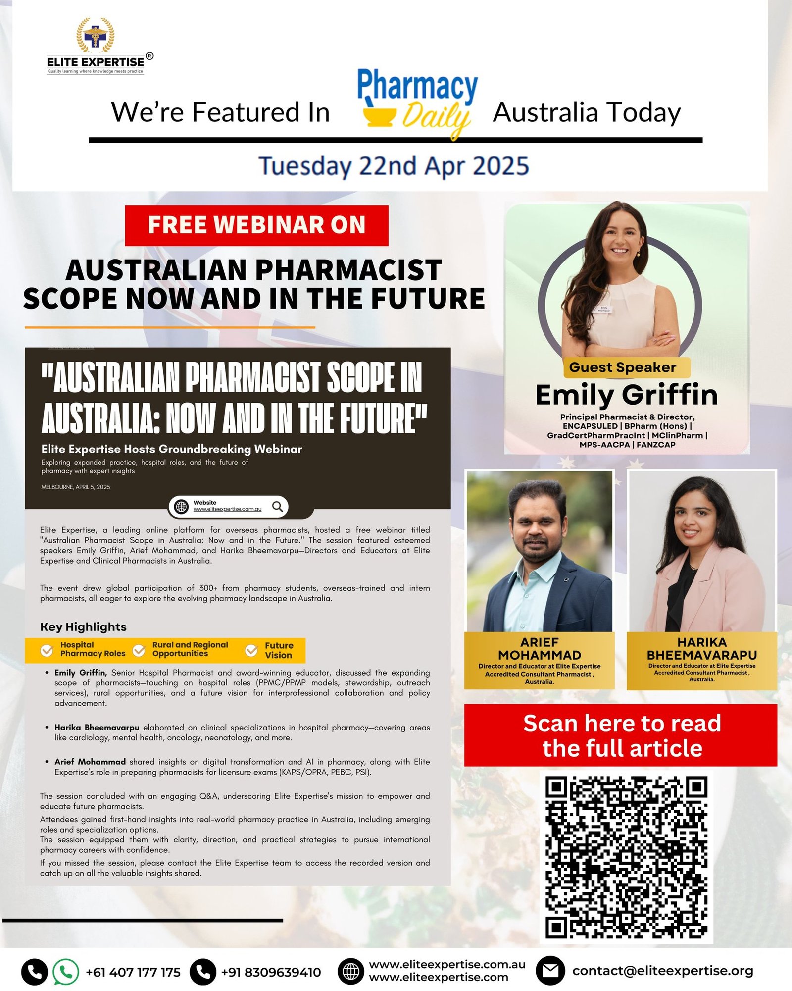 “Australian Pharmacist Scope in Australia: Now and in the Future”, hosted by Elite Expertise and featuring guest speaker Emily Griffin, Senior Clinical Pharmacist and award-winning educator. Alongside our directors Harika Bheemavarpu and Arief Mohammad, the session explored hospital roles, rural opportunities, AI in pharmacy, and licensure pathways including KAPS, OPRA, PEBC, and PSI—empowering overseas pharmacists to pursue clinical excellence and global careers. Read more about our feature!